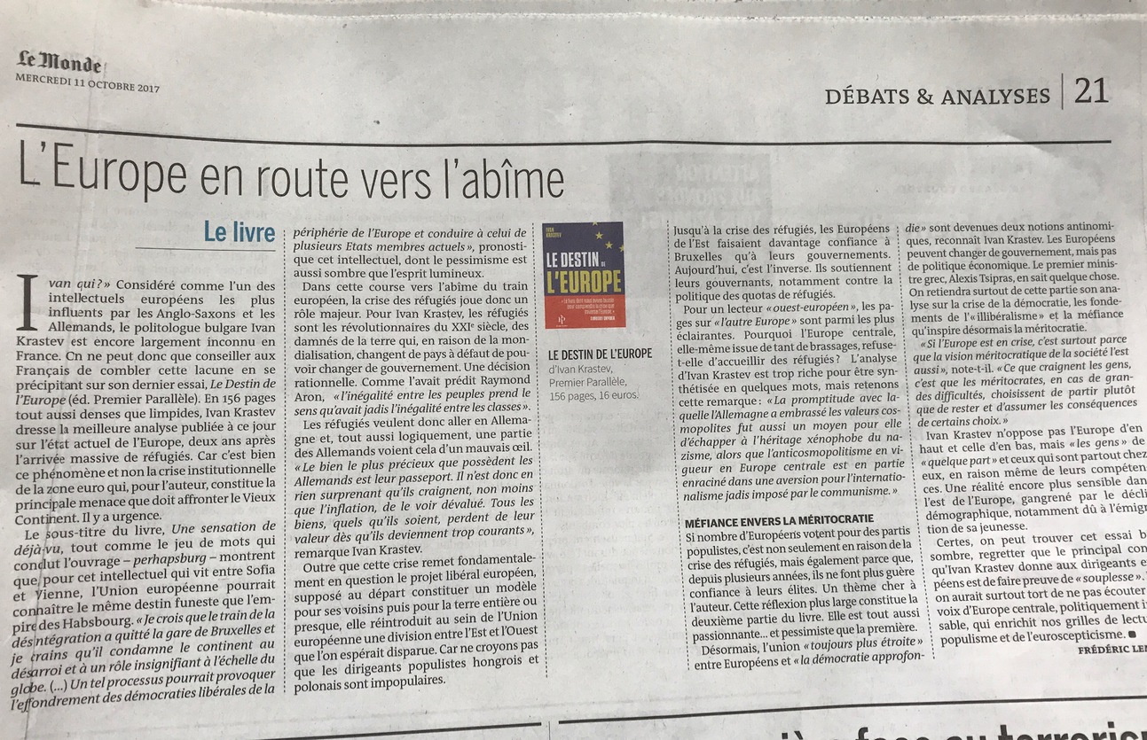 Le Monde recommande de "se précipiter" sur Le Destin de l'Europe, d'Ivan Krastev