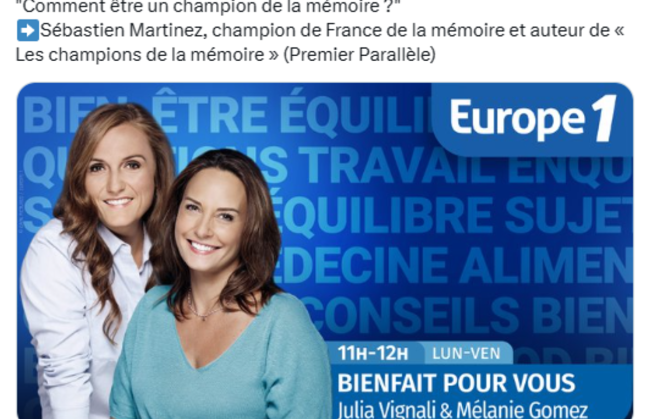 Sébastien Martinez est l'invité de l'émission Bienfait pour vous sur Europe 1 à l'occasion de la sortie de son livre Les Champions de la mémoire.